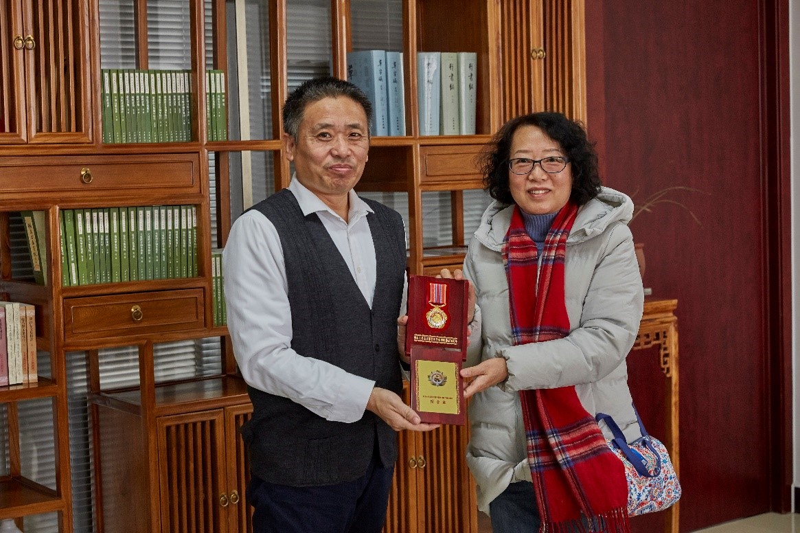 新年团拜活动中,最激动人心的时刻是为李昌宁老师颁发抗美援朝70周年纪念章。李昌宁老师已是耄耋老人,未能亲临现场,奖章由石刚颁发,李昌宁老师的女儿代为领取。学院通过举办奖章颁发仪式,是为了满怀感激之情向最可爱的人,英雄的中国人民志愿军致敬!向牺牲在朝鲜土地上的光荣的烈士们和他们的家属致敬!向尚健在的参加那次战争的整整一代人致敬!