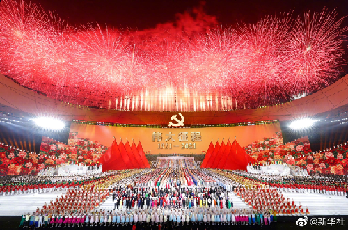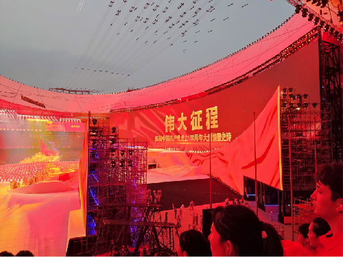 经过了长时间的准备和演练,正式演出的日子终于到了!6月28日,暮色渐深。暖场环节脍炙人口的歌谣和导演开场前与观众的诚挚交流,充分带动了会场内的情绪。红旗翻涌,人声沸腾,久久不绝于耳。习近平总书记,热情地向观众席招手示意,致以问候。全场观众以极饱满的精神面貌等待着,演出开幕的那一瞬。本次演出,共计四个篇章,以艺术手法再现了中国共产党百年来的不断奋斗、追求、胜利和展望的历史进程。加之恢宏壮阔的歌舞表演,震撼着每一位观看者的内心。伴随着《领航》一曲响起,本次演出拉下帷幕。数千名演员,在会场中央形成了如一条金光大道般的阵型直至远方,万千繁花烟火在空中绽放。那一刻每一位演员、观众的眼中噙满泪水,那是源自灵魂深处的震撼、感动。