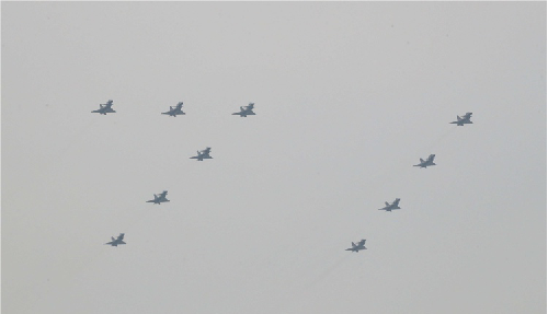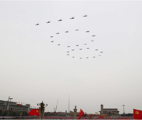 大会开始,雄鹰翱翔,振翅长空。中国人民解放军71架战机飞向天安门广场, 向党致敬,向祖国致敬,向人民致敬。“100”“71”字样掠过长空,精彩的表演激起一阵阵欢呼声。