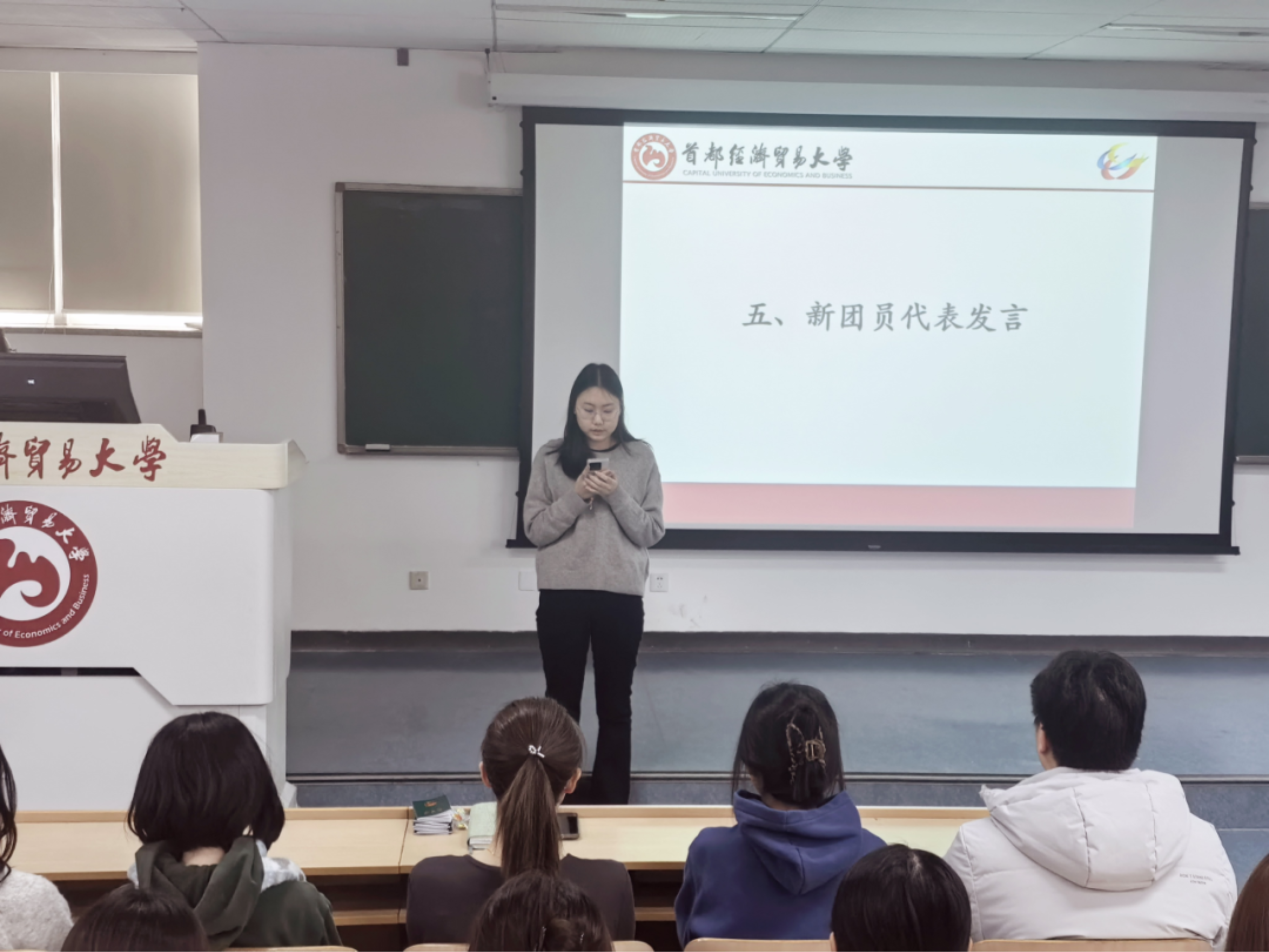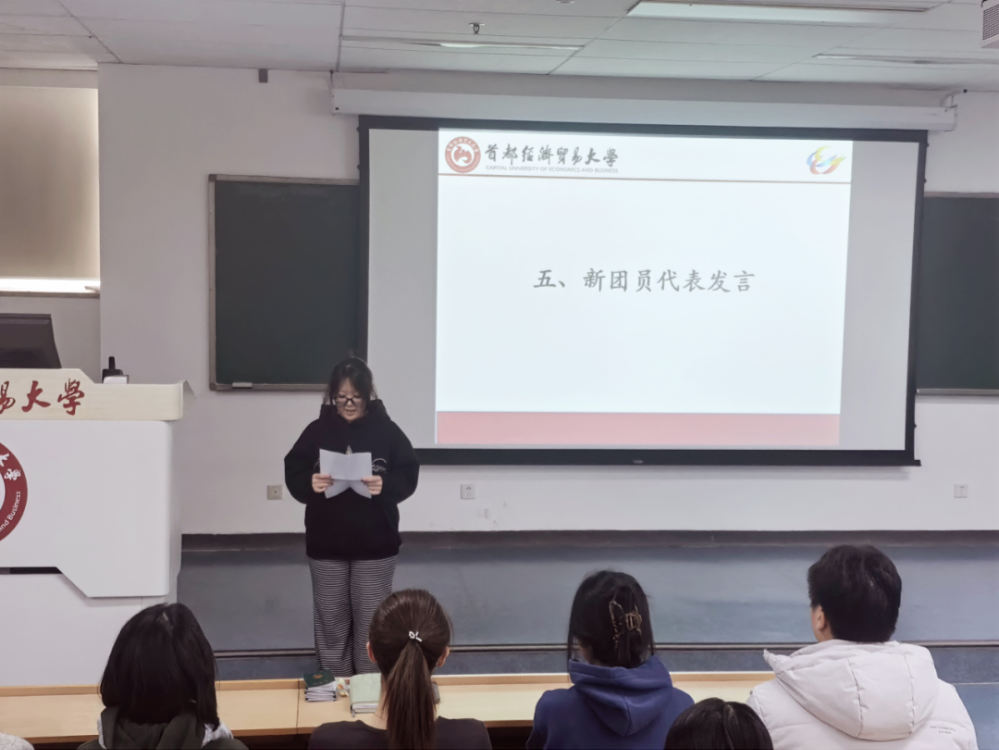 武若涵引领全体新发展团员一同学习了《团章》中的节选内容。随后,高慧莹、杨轶如作为新团员代表进行了发言。她们表示,成为团员既是荣耀,更是沉甸甸的责任,未来将持续以优秀团员的标准要求自己,勤学锤炼、增长才干,在校园发挥先锋作用,在社会实践中践初心,用青春诠释“永远跟党走”的理想信念。闻雨轩作为老团员代表上台发言。她充分结合自身在团组织中的成长经历,勉励新团员将个人理想融入国家和社会发展,在实践中锤炼本领,努力成长为有理想、敢担当、能吃苦、肯奋斗的新时代优秀青年。