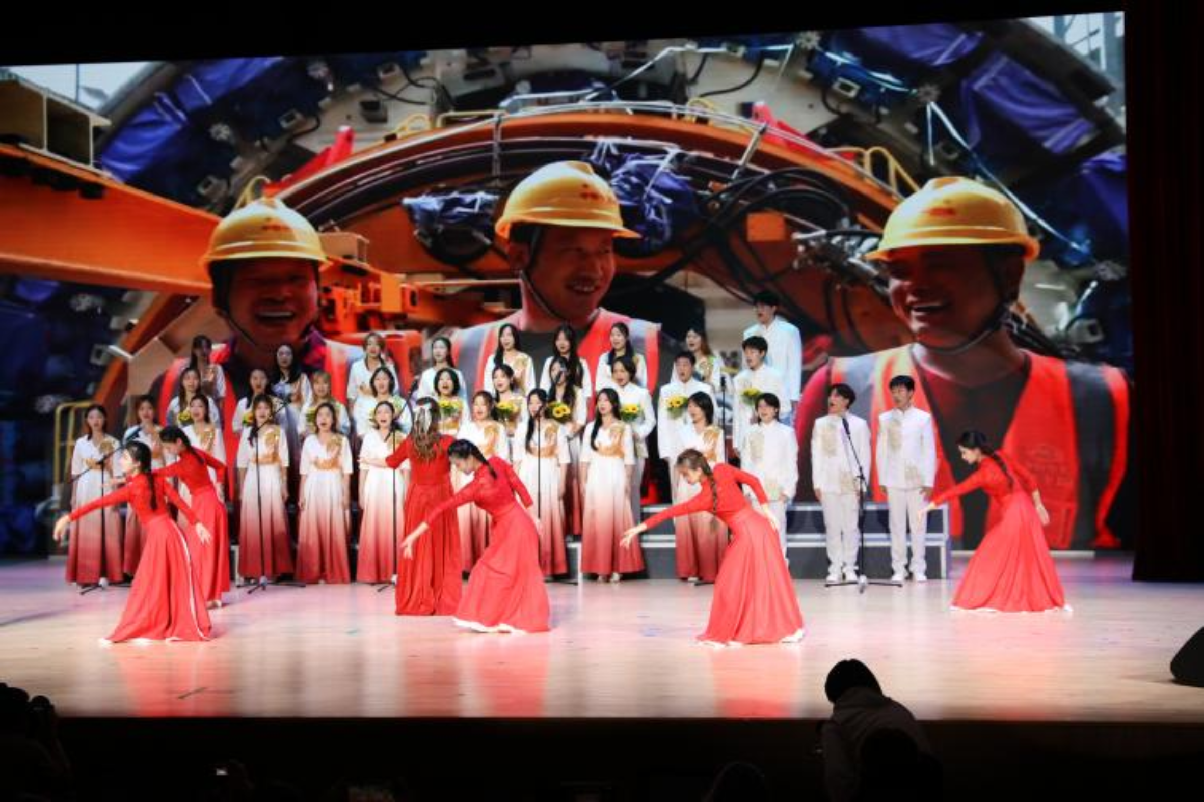 话音落处,钢琴伴奏缓缓响起,合唱队员随即齐声开唱,歌声悠扬而起。第二排的表演者们缓缓扬起手中的向日葵,紧接着,第三排的国旗也随之轻轻挥舞。随后,当“我爱你中国”的歌词缓缓唱出,小提琴旋律适时加入,与钢琴伴奏交织相融,歌声更添深情与力量。第一排的同学同步扬起手臂,舒展指尖,将灵动优美的歌唱手势,与歌声、乐声交织相融,满含赤诚。
