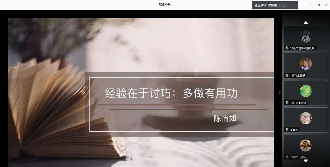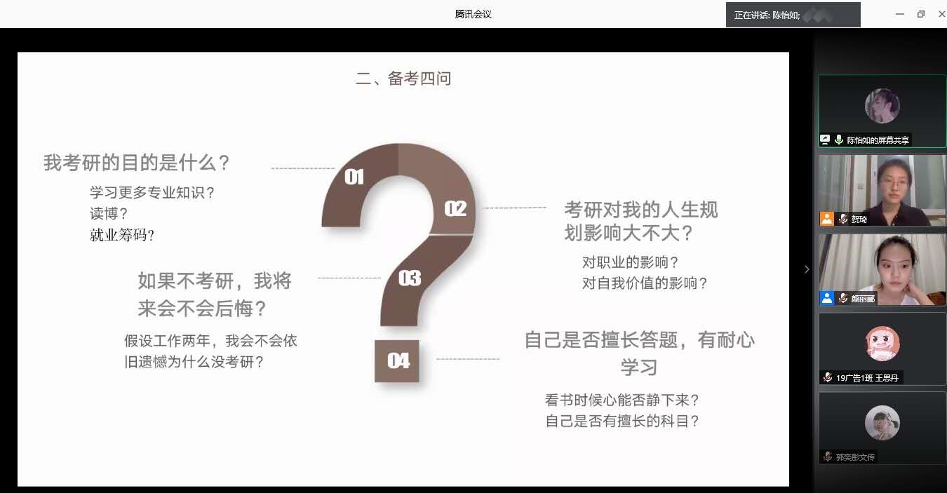 这次分享会学院特邀了四位考研成功“上岸”的学长学姐为大家进行经验分享,他们分别是:2019届传播学专业陈怡如,考入中央民族大学新闻与传播专业;2019届传播学专业郑洵,考入性爱电影 新闻与传播专业,2020届传播学专业胡嘉容,考入北京理工大学视觉传达专业,以及2020届汉语国际教育专业刘洋,考入北京师范大学(珠海)汉语国际教育专业。