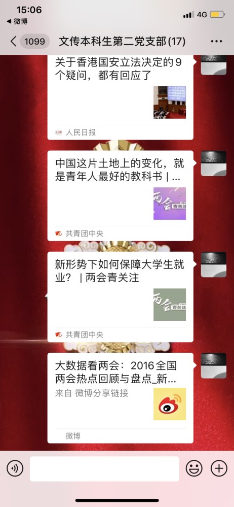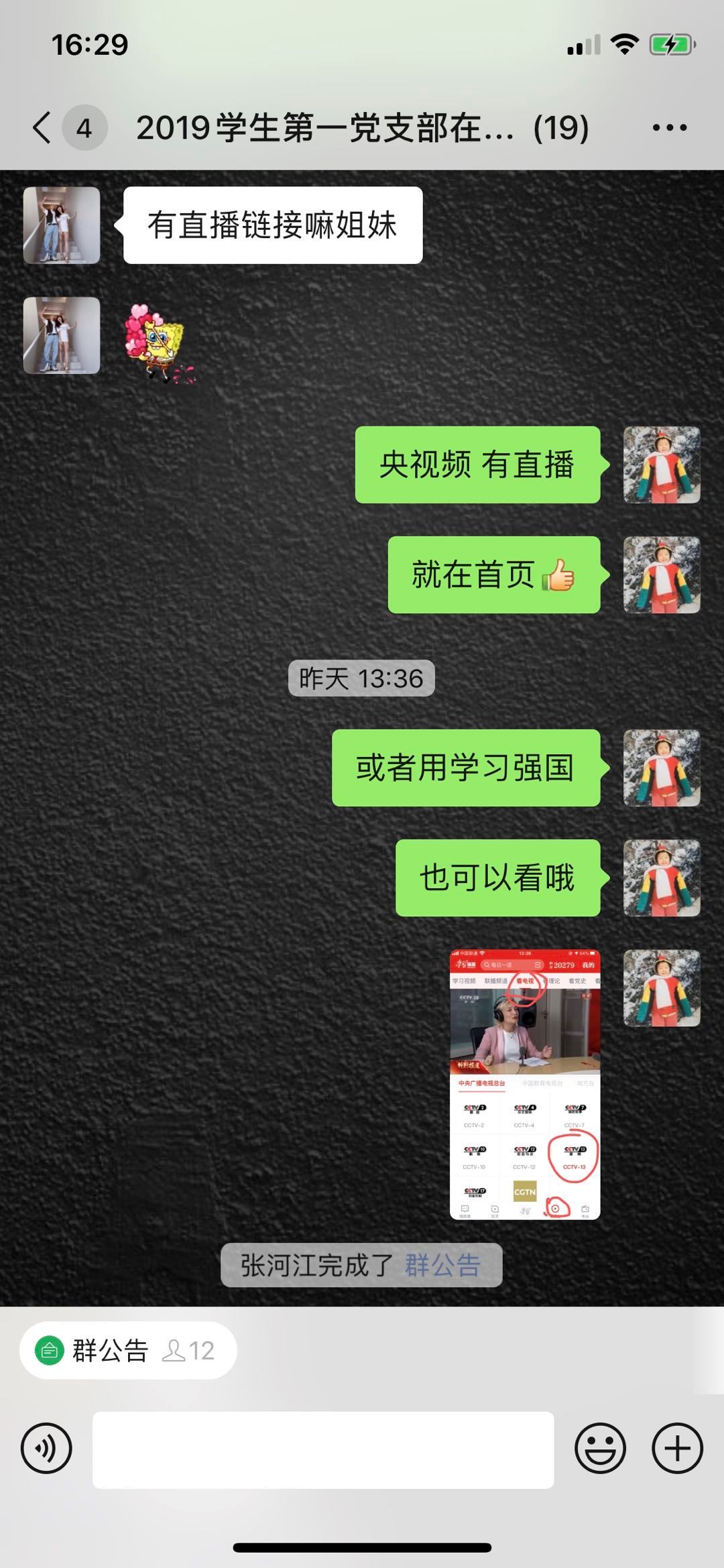闭幕会直播开始前,学生党员们热情高涨,纷纷在微信群里互动讨论,抒发对祖国的热爱之情和对美好未来的无限展望;直播开始后,大家认真听取会议内容。在答记者问环节中,党员们纷纷表示记者们提出的问题正是自己想要了解的。在观看过后,大家围绕会议内容和自己在两会期间关注的热点话题进行分享,并开展了讨论和交流。