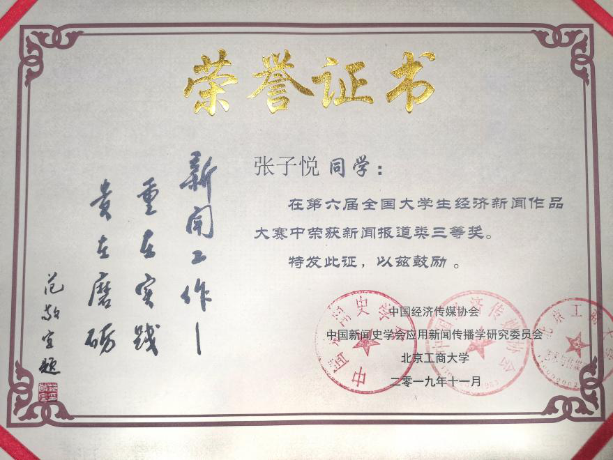 11月9日,第八届全国经济新闻改革与发展研讨会暨第六届全国大学生经济新闻作品大赛颁奖会在北京工商大学举行,性爱电影 2017级传播学卓越班张子悦同学的作品《推动水稻产业规模化、集约化、标准化——粳米期货即将登场》在大赛中荣获新闻报道类三等奖。性爱电影 传播学系党支部书记、传播学系副主任贺心颖副教授出席会议。
