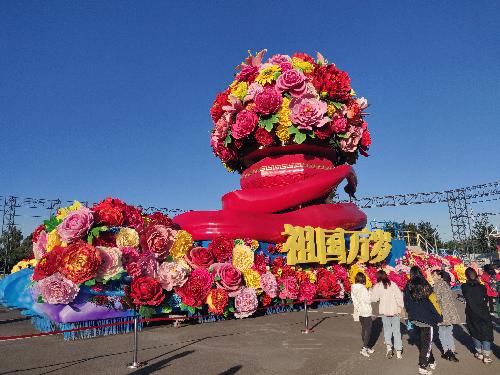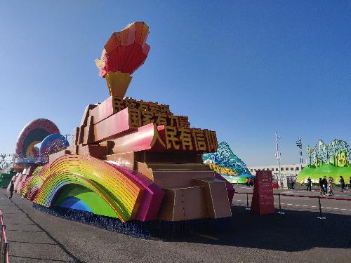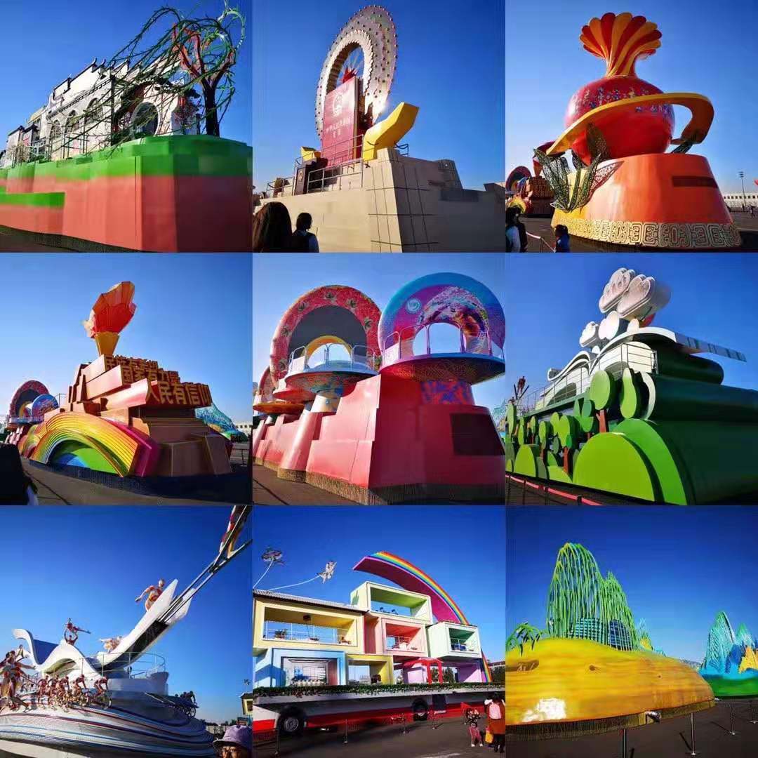 流光溢彩的大型彩车有“圆梦奥运”、“不忘初心”、“中华儿女”、“祖国万岁”等,依次排开,仿佛一条绚丽的长龙,吸引了同学们驻足欣赏和与花车合影留念。