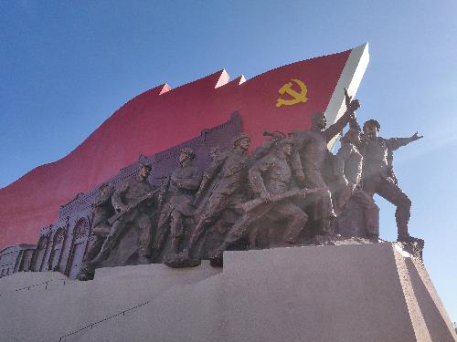 “开天辟地”彩车以层叠的五星红旗,奋勇向前的战士群雕及中共“一大会址”嘉兴南湖红船浮雕为主题形象,浮雕的制作都是由央美的专家亲自操刀,石质基座寓意党成立与发展的坚实之感和奋进决心。寓意中国共产党诞生这一开天辟地的大事变,深刻改变了近代以后中华民族发展的方向和历程,深刻改变了世界发展的趋势和格局。