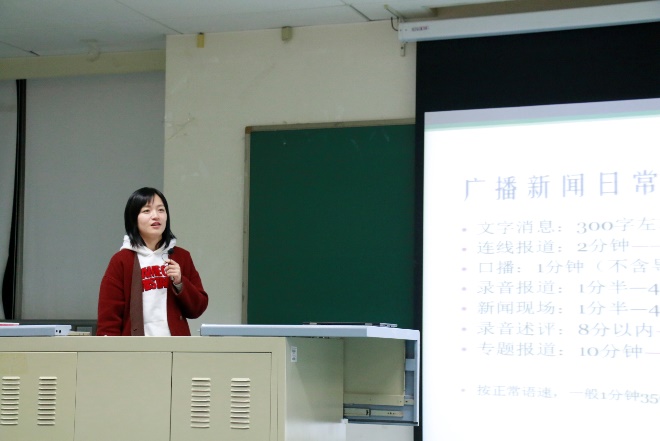 史喻首先介绍了文字消息、连线报道、口播、录音报道等广播新闻中常见的报道体裁,提出了广播记者的从业要求,即正常语速一般在1分钟350字左右、报道中要坚持口语化等原则。