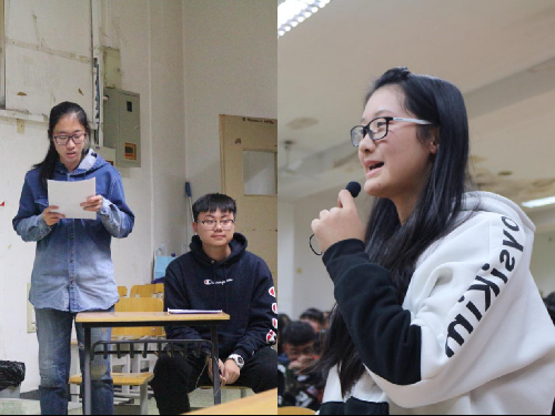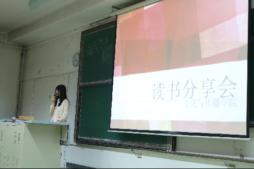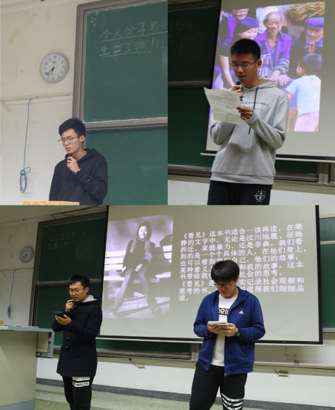 第一个进行分享的是来自传播学一班的学生,分享书目为柴静的《看见》。在简单的书目介绍后,两名展示学生声情并茂地朗读书中选文。通过分享使在场学生了解了柴静的成长故事,感受了中国社会十年的变迁发展,更清楚了记者的初心。