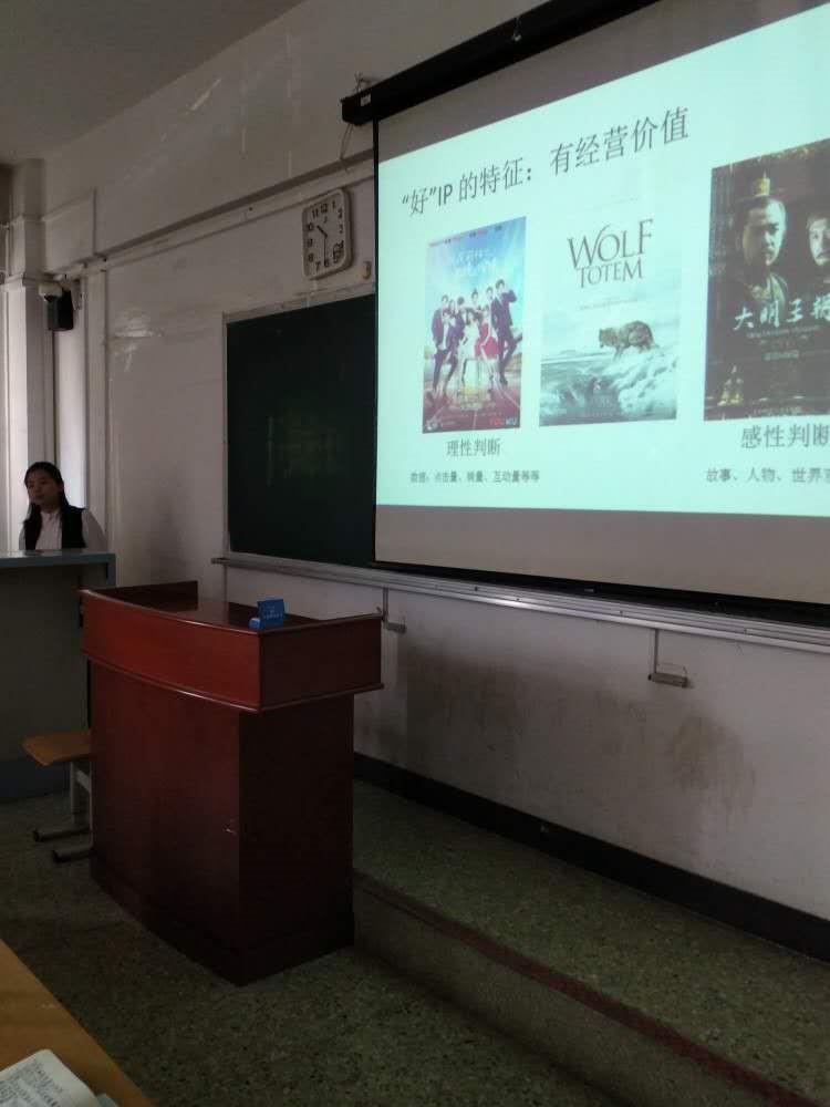 2017年3月29日上午,2015级传播学卓越班的传媒经济学课堂上来了一位特殊的嘉宾,她就是拥有多年IP产品运作经验的资深IP策划人、乐视影业制片人宫明月老师。宫老师应传媒经济学课程授课教师高亢之托,来为卓越班的全体同学做一场题为《IP经营 让你的IDEA价值百万》的专题讲座。卓越班的班主任吴三军老师也出席了讲座。