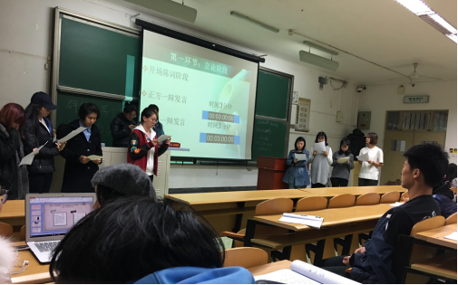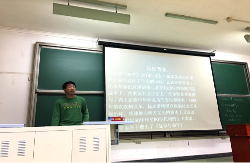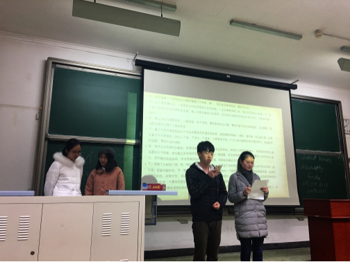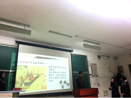 每个组都根据自己所读的书目的特点进行了精心的准备和编排。《中国人》书目组介绍了书的主要内容他们对书的思考;《战争与和平》书目组对这部宏大的巨著的背景以及作品内容进行了解读,留下了“什么是战争,什么是和平”的问题;有三个小组选择了《乌合之众》做分享,第一组设计了一个情景剧,先为大家播放了一段影片,然后提出“群体不善于思考却急于行动”的问题,小组成员以回答问题的方式提出了自己对书的理解和观点;分享《乌合之众》的第二组,提出了“如何在群体中保持理性与通脑清醒”的方法;分享《乌合之众》的第三组采用更加新颖的辩论形式,把书中提炼出来的观点作为他们的辩题。分享《曾国藩传》的同学们采用历史穿越剧的表演形式介绍了人物简介和故事梗概,多角度地对曾国藩进行评价;分享《道德情操论》的小组通过对老子《道德经》的研读,分享了对“道德”、“情操”的学习心得;伴着悠扬的琴声;研读《论语》小组带着大家一起“穿越”回到了千年前,以情景剧的形式,展示了学子们对这部经典古籍的思考与讨论。