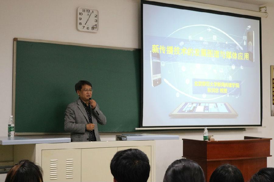 本次受邀的嘉宾是北京师范大学新闻传播学院副院长、传播效果实验室主任张洪忠教授,他以“新媒体技术的发展图谱与媒体应用”为主题,与同学们进行了深入的探讨和交流。