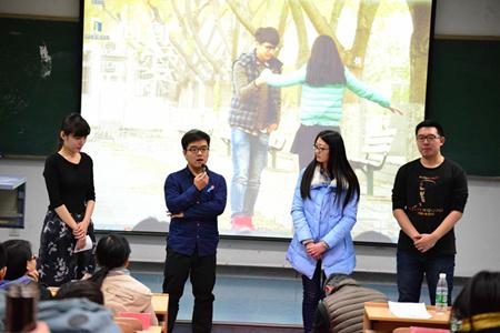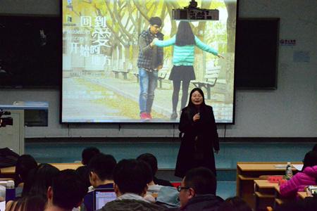 主创访谈结束后,进入大家期待已久的微电影放映环节。将近40分钟的电影大家看得津津有味,现场不时传来同学们开心的笑声。随着影片剧情的推进,大家也渐渐被电影剧情而打动。影片的结尾彩蛋部分邀请了来自全国各地以及俄罗斯不同高校的情侣阐述各自对守护与爱的理解,并特别加入了刚步入婚姻殿堂的刘吉冬老师的理解,将影片守护与爱的主题引向高潮。