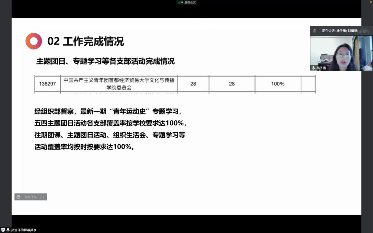 大会第一项,按照分团委组织部、社会实践部、志愿者团、行政中心、涉外部、文艺部、体育部、新媒体中心、笃行学会的顺序,各部长对线上开学两个月以来的所有工作进行汇报总结,并对未来的工作提出展望。