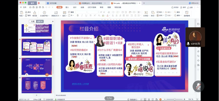 宣讲会以新浪财经视频组、中国品牌创新实验室项目、新浪财经M+Lady项目、新浪财经数码项目、新浪财经科技项目、黑猫项目组、新浪财经活动运营部的顺序依次向大家介绍,详细说明了每个项目组的发展历程、项目ip、活动特点以及人才需求,每一个ip项目都将给大家提供宽广平台,让同学们可以根据各自的优势和兴趣来进行选择。
