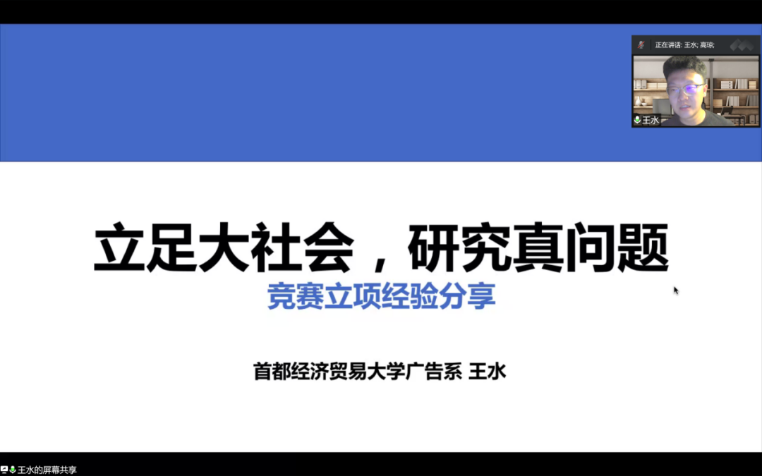 2022年5月26日19:30,性爱电影 “扬帆未来,筑梦远航”系列竞赛立项经验分享会在线上如期举行。本次会议由党总支副书记高琼主持,广告学系党支部书记兼系副主任王水主讲。