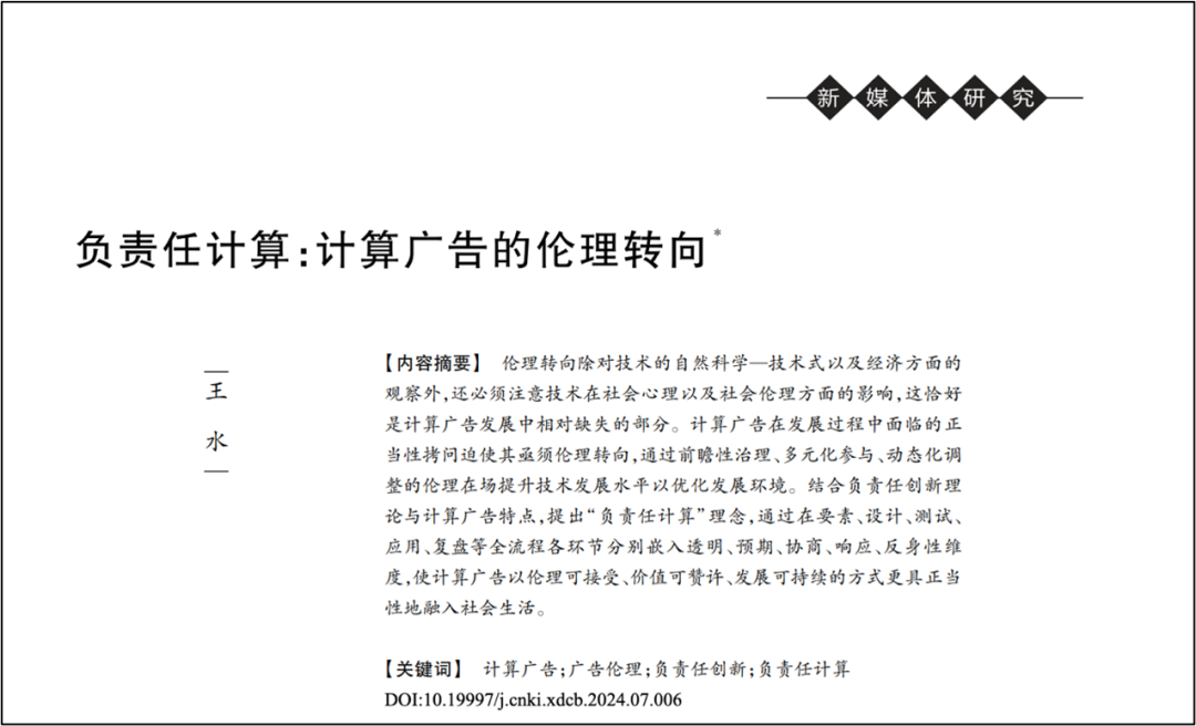 性爱电影 教师王水于2024年于现代传播发表论文《负责任计算:计算广告的伦理转向》,该论文获得中国国际广告节长城奖学术作品类银奖。
