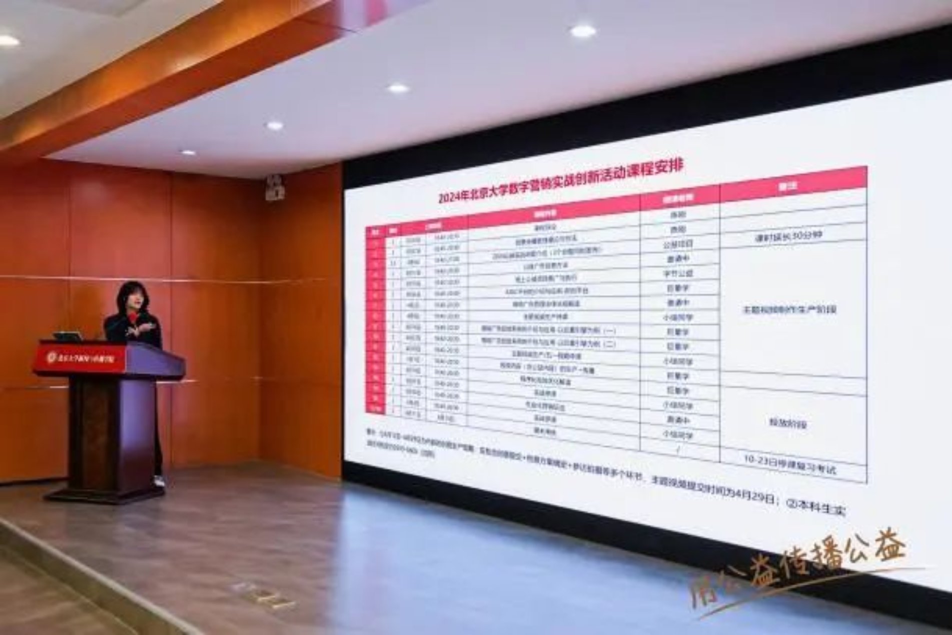 北京大学新闻与传播学院副院长、教授陈开和发表欢迎致并表示,此门课程是广告学专业数智化转型的生动实践。之后,北京大学教务部副部长刘建波、北京大学新闻与传播学院院长陈刚、抖音集团企业社会责任部战略与品牌总经理李英、中国人民大学新闻学院广告与传媒经济系主任王树良依次发表致辞。通过此环节,文传学院各师生对该项目的发展历程、支持团队及内容要求等有了深入的了解。