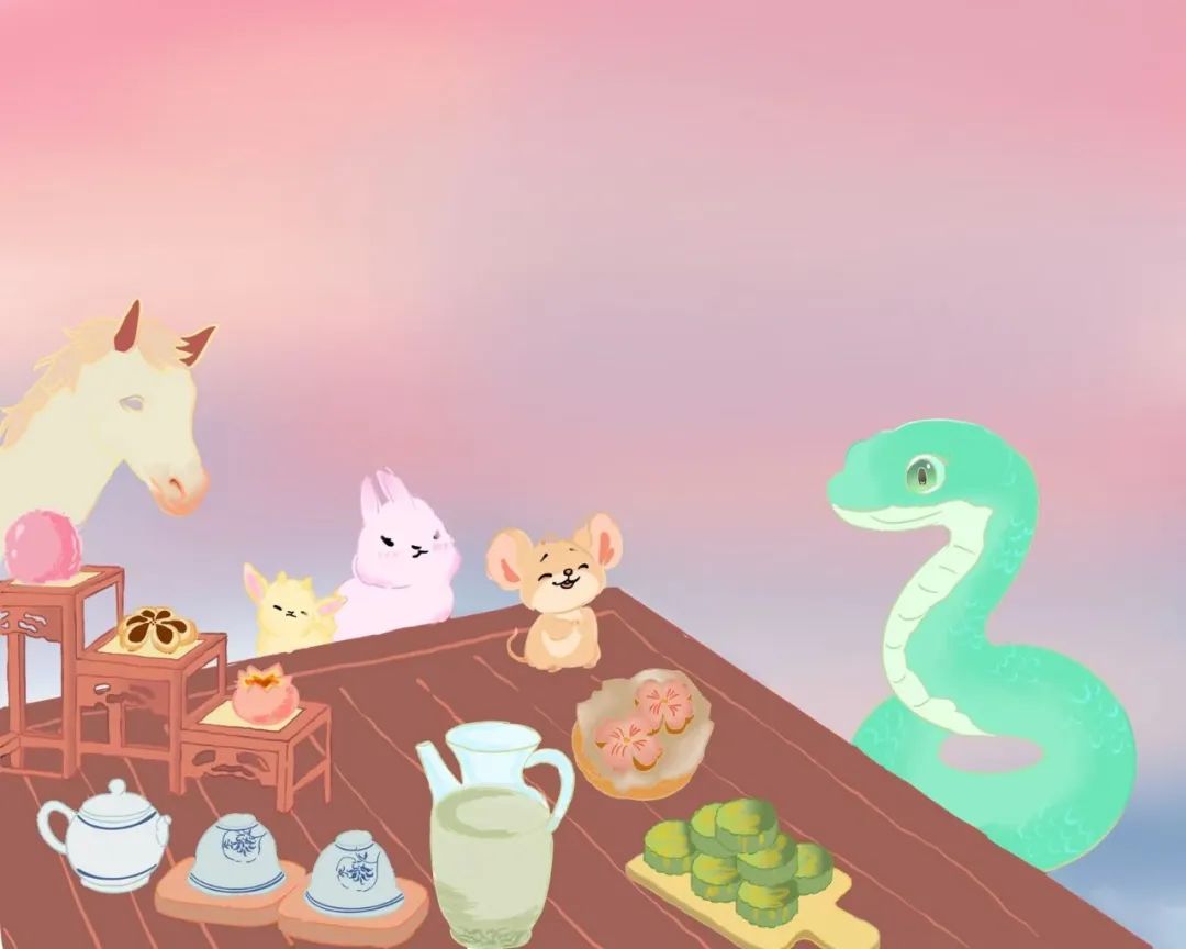 告别了花海,小青蛇继续前行,来到了一座古老的城堡。城堡里的动物居民们热情好客,得知小青蛇前来拜年,立刻为它筹备了一场盛大的茶话会。桌上摆满了各式各样可口的点心和饮品,大家围坐在一起,一边品尝美食,一边分享着过去一年的奇闻趣事,欢声笑语回荡在城堡的每一个角落。临走之际,小青蛇悄悄施展自己的灵力,为城堡中的动物朋友们带来好运,祝福它们在新年丰衣足食,生活美满。